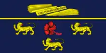 Azure, fimbriated and parted per fess by a line Or. In base a Bunga Raya or hibiscus flower between three tigers passant regardant two and one all proper; and in Chief a bundle of seventeen strips of the leaves of Palmyra Palm or borassus flabellifer Or inscribed with the words 'ILMU PUNCHA KEMAJUAN'.