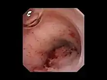 | A cystoscope showing a tumor in the ureters. Here it threatens to completely cut off flow to the ureters. | |