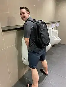 A urinal (US: /ˈjʊərənəl/, UK: /jʊəˈraɪnəl/)[1] is a sanitary plumbing fixture similar to a toilet, but for urination only. Urinals are often provided in men's public restrooms in Western countries (less so in Muslim countries). They are usually used in a standing position. Urinals can be equipped with manual flushing, automatic flushing, or without flushing, as is the case for waterless urinals. They can be arranged as single sanitary fixtures (with or without privacy walls), or in a trough design without privacy walls.