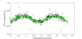 RSA magnitude estimation based on a multivariate approach based on joint analysis of ECG and respiration.[15] The green line shows the heart rate variations averaged over several breathing cycles. This clearly shows the trends that are typical of RSA.