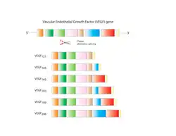 - ↑ Tischer, E; Mitchell, R; Hartman, T; Silva, M; Gospodarowicz, D; Fiddes, JC; Abraham, JA (25 June 1991). "The human gene for vascular endothelial growth factor. Multiple protein forms are encoded through alternative exon splicing". The Journal of Biological Chemistry. 266 (18): 11947–54. doi:10.1016/S0021-9258(18)99049-6. PMID 1711045.