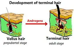 Vellus hair replaces lanugo hair on a human fetus at 36 to 40 weeks of gestation.[2] The growth cycle of vellus hair is different from the growth cycle of terminal hair. At puberty, androgen hormones cause much of the vellus hair to turn into terminal hair and stimulate the growth of new hair in the armpit and the pubic area. In men, this change in vellus hair also occurs on the face (beard) and the body.