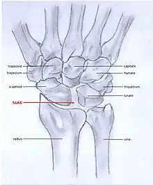 2. 1 2 3 4 5 6 Shah, CM; Stern PJ (2013). "Scapholunate advanced collapse (SLAC) and scaphoid nonunion advanced collapse (SNAC) wrist arthritis". Curr Rev Musculoskelet Med. 6 (1): 9–17. doi:10.1007/s12178-012-9149-4. PMC 3702758. PMID 23325545.