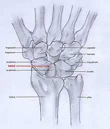 - 1 2 3 4 5 6 Shah, CM; Stern PJ (2013). "Scapholunate advanced collapse (SLAC) and scaphoid nonunion advanced collapse (SNAC) wrist arthritis". Curr Rev Musculoskelet Med. 6 (1): 9–17. doi:10.1007/s12178-012-9149-4. PMC 3702758. PMID 23325545.