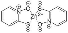 Zinc pyrithione (or pyrithione zinc) is a coordination complex of zinc. It has fungistatic (inhibiting the division of fungal cells) and bacteriostatic (inhibiting bacterial cell division) properties and is used in the treatment of seborrhoeic dermatitis[2] and dandruff.