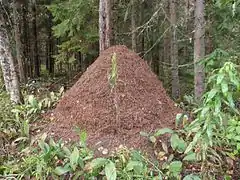 Wood ants (Formica paralugubris) often incorporate large quantities of solidified conifer resin into their nests. Laboratory studies have shown this resin inhibits the growth of bacteria and fungi in a context mimicking natural conditions.[58] The ants show a strong preference for resin over twigs and stones, which are building materials commonly available in their environment. There is seasonal variation in the foraging of ants: the preference for resin over twigs is more pronounced in spring than in summer, whereas in autumn the ants collect twigs and resin at equal rates. The relative collection rate of resin versus stones does not depend on infection with the entomopathogenic fungus Metarhizium anisopliae in laboratory conditions, indicating the resin collection is prophylactic rather than therapeutic.[59]