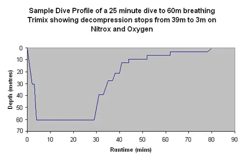 - Required decompression stop depth and time, also assuming immediate ascent at recommended rate.