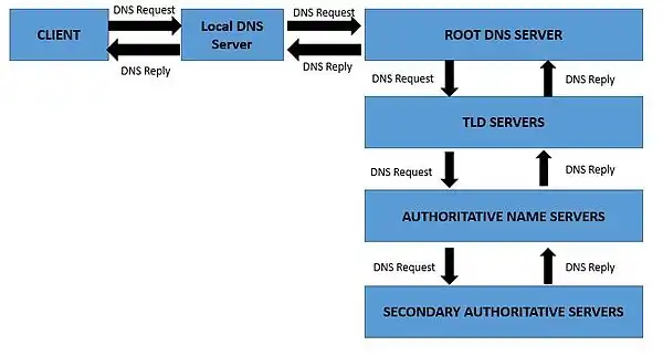2. The LOCAL DNS will forward this query to the ROOT Name Server and a reply will be sent to the LOCAL DNS. This reply will contain the NS and A records of corresponding TLD server.