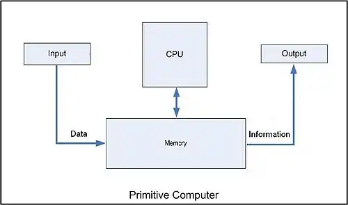 The way components inside a computer fit together helps describe how the computer works. Data comes through the Input and is sent to the CPU. The CPU processes the data, normally based on a program or the data which it already has in its memory. For example, in modern computers, when you press the power button on your computer, there is some data (a program) that is automatically sent to the processor from memory. When a CPU is finished processing some data, the result can be sent back to a memory or it is sent to the output.