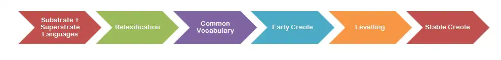 According to this hypothesis, relexification occurs for each substrate language in the community where the creole is developing. This means that speakers of one substrate language will have an early creole lexicon that varies slightly from the creole lexicon of others who speak a different substrate language. However, since these early creole lexicons share a common target language, they will share many common features. When early creole speakers start speaking to one another using their own relexified lexicons, they learn parts of other relexified lexicons and start levelling out the differences between them. Once this levelling is complete, the variation in the lexicons used by different speakers is greatly reduced, and the creole is considered to be a stabilized language [12]. The stages in creole genesis according to the relexification/levelling hypothesis are illustrated below.