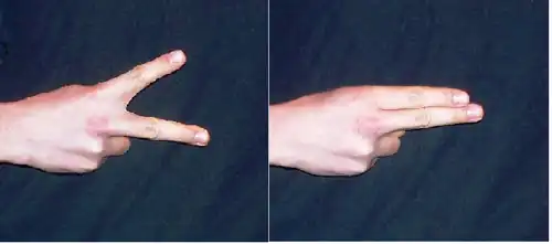 There is some evidence to the theory that home sign systems begin as imitations of gestural signs produced by the child’s parents. Spontaneous gestures are commonly produced by users of spoken language and often indicate individual events [17]. For example, when talking about opening something with scissors, many people tend to move their first two fingers apart and then back together, like the “snip-snip” action of scissors. This is demonstrated in the figure to the left.