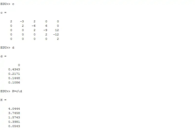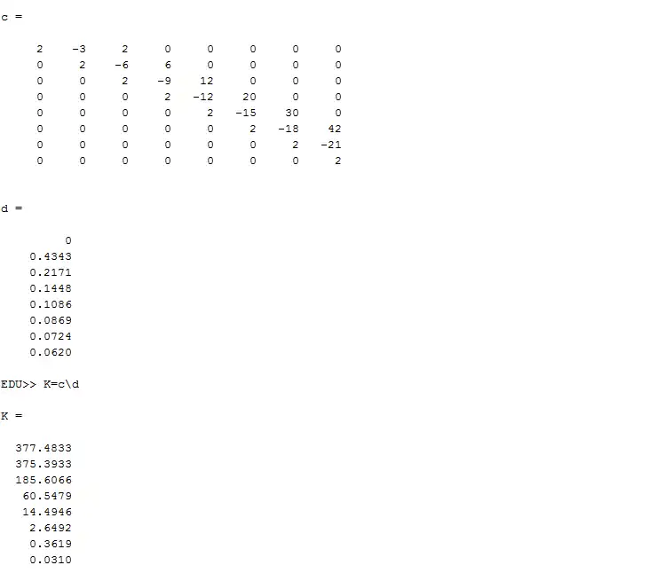 Plugging these values into the ODE and equating them to the excitation, and then solving them by using a upper triangular matrix as before (just as in the n=3 example) in Matlab: