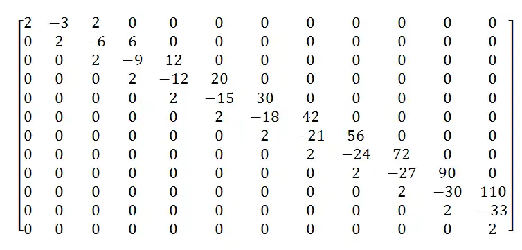 Using all of the above equations, (1), (2), (3), (n-2), (n-1), (n), we can then determine the A matrix to be: