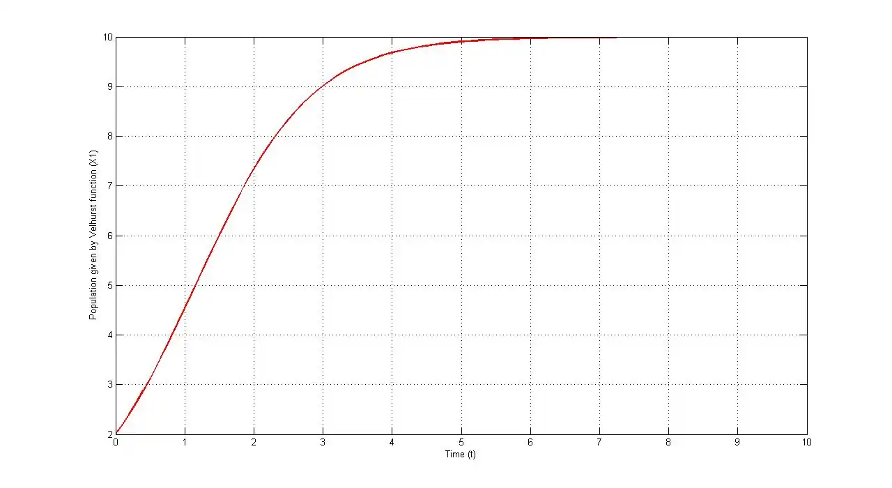THE PLOT SHOWING THE POPULATION CHANGE W.R.T TIME, HERE VERHULST MODEL IS USED TO COMPUTE THE POPULATION WHERE XO=INITIAL POPULATION=2