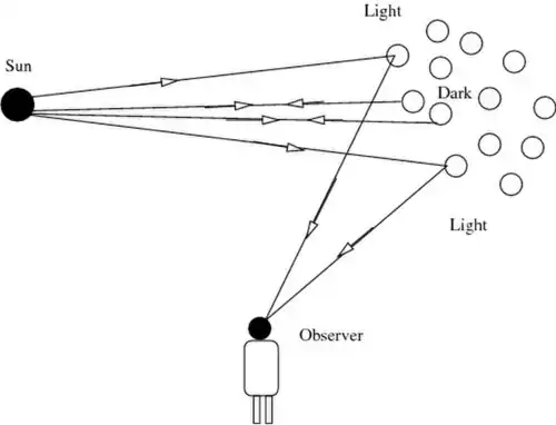 The curvature of the water droplets causes some light rays to reach the observers whereas other rays are reflected away from the observer. This creates the darker Alexander's band (see Figure 2).