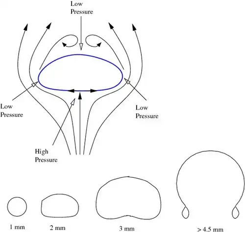 We have assumed that raindrops are spherical in the above calculations. But are they really spherical? The answer depends on the size (and therefore the velocity) of the raindrops. The motion of air around the raindrop leads to low pressure regions on the sides and for small raindrops conditions similar to Stokes flow exist. There is also a region of low pressure at the top of the raindrop due to flow separation at higher Reynolds numbers. As a result a raindrop evolves from a spherical shape to a bean-shaped form and finally breaks apart at sizes above 5 mm (see Figure 7).