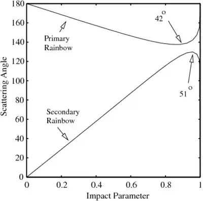 The scattering angle is defined as the angle between the incident and the transmitted rays. For the primary rainbow, the scattering angle is the angle between the incident rays and the rays transmitted after one internal reflection. For the secondary rainbow, the scattering angle is the angle after two internal reflections. A plot of the scattering angle as a function of the impact parameter is shown in Figure 4. The scattering angle reaches a peak at a value of 180°-42° for the primary rainbow and at an angle of 180°-51° for the secondary rainbow.