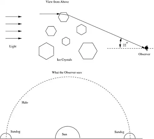 Sundogs are bright light sources found (under the right conditions) on both sides of the sun when it is low on the horizon (near sunset or sunrise) at an angle of 22 to the observer. They are caused by light refracted from ice crystals (ice has 1.31) which are flat with hexagonal shape, falling with the flat size nearly horizontal (see Figure 9).