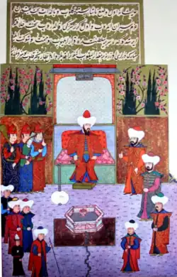 Orhan organized his state in a tight administrative arrangement, dividing it into Sanjaks (Ottoman Turkish: سنجق or سنجاق = districts). Prior to his crossing into Europe, the Sanjaks were: Sultan-öyügü, Hudavendigar-eli, Koca-eli and Karasi-eli.[79] He appointed his son Sulāymān a governor over İzmit, his other son, Murad, a governor over Bursa, and his cousin Gündüz Alp to govern Karacahisar. Additionally, Orhan ordered that silver and gold coins be minted, in the Seljuk style, holding his own name and the name of the Abbasid Caliph in Cairo.[80]