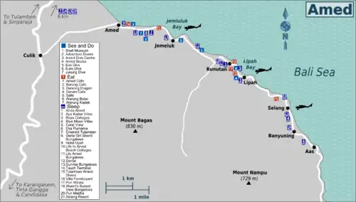 Tulamben is a small fishing village, 30 km north of Amed, about 20-30 min by road. As well as local dives off the various Amed beaches a notable attraction is diving the wreck of the USAT Liberty at Tulamben. Some divers base themselves at Tulamben itself where all of the hotels have either in-house dive operations or are associated with one of them. Local operators run shore dives, since both the wreck and the two other local dive sites are within 100m of the shore.