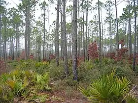 The generally flat terrain of the forest is pocked by bays, sinkholes, and swamps. Some soils are excessively drained, others poorly drained. The largest area of natural forest is dominated by longleaf pine and slash pine with an understory of palmetto, gallberry, and wiregrass. The Munson Sandhills just south of Tallahassee have turkey oak and bluejack oak, species favored by the deep well-drained sandy soil, as well as pine.