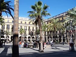 - 🌍 Plaça Reial (next to La Rambla). This square is famous for the nightlife and the uniform architecture, and features fountains and palm trees. It was built during the 19th century on the site of a monastery, after the Mendizábal law expelled the monks. After some years Antoni Gaudí designed the streetlights which are still there. It has lots of activity during the day, thanks to the many terraces of the bars and restaurants.