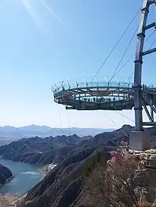 - Shilingxia (石林峡), Diaowo Village, Huangsongyu Township (Bus 852 from central Beijing to Pinggu District Bus Terminal and then local bus No.25). The park's large hiking loop will take you past steep rock formations and small waterfall streams. The scenery is not as spectacular as in nearby Tianyun Mountain. However, the star attraction isn't the nature but a UFO shaped structure that is the world's longest cantilever viewing platform. The bottom of the UFO platform is glass and the structure is perched over the highest peak in the park. For kitschy fun, a classic flying saucer with 2 blue alien passengers is suspended in the center of the viewing platform.