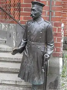 These days, Köpenick is not exactly a household name among Germans, as the quiet outlying district of Berlin is not exactly famous for much. If Germans do know it, then for a bizarre episode in local history turned into multiple works of theater, film and literature by big names of German cultural production of the 20th century. The down on his luck shoemaker and small-time criminal Friedrich Wilhelm Voigt (born 1849), who by the year 1906 had tried to make an honest living but faced the bizarre regulations of his day that barred an ex-con from living basically anywhere (in the most famous play, he is presented as being unable to get a residence permit because he has no job and unable to get a job because he has no residence permit - a Catch 22 avant la lettre). Thus, he decided to run his most famous con of them all, with a used military uniform and his acquired knowledge of military customs and forms he stopped a group of Prussian soldiers, ordering them to follow him before he took them by train to (the then independent city of) Köpenick. There, he had the mayor arrested "on highest orders", and "confiscated" the municipal treasury - a value of some 4000 mark - duly noted with a receipt exact to the last pfennig, which Voigt signed in the name of his former jail director. While Voigt escaped with no-one the wiser, he was ultimately caught and sentenced to four years in prison. However, the German press loved his exploits, and even Kaiser Wilhelm II is said to have been sympathetic, so he was pardoned. Voigt would manage to capitalize on his fame, and lived a mostly uneventful (and non-criminal) life until his death in Luxembourg in 1922. German playwright Carl Zuckmayer would turn the story into a play in 1931, which was, of course, much more than just a "funny story", given the rise of the uniformed Nazis and his treatment of the Catch-22 that led Voigt to his act. It is this treatment that many subsequent movie adaptations, including a 1956 one with Heinz Rühmann and a 1997 one with Harald Juhnke, are based on. Today, a statue of the Hauptmann stands in front of the Rathaus (city hall) of Köpenick, the site of his most famous exploit.