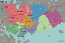 - North Beverly — Placid, mostly residential neighborhood with businesses scattered on main thoroughfares of Cabot, Dodge, Conant, Enon, and McKay Streets including the North Beverly and Commodore Plazas. Subdivided into the sub-neighborhoods of Raymond Farms and Folly Hill/Apple Village. Possesses the North Beverly train station along with Beverly Airport.