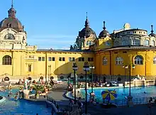 - The bath was built in 1909 in the present-day City Park. This is the largest spa in Europe, and probably the nicest one in Budapest. A vast bath complex amidst beautiful architecture, it contains 3 outdoor pools including a large lap pool, at least 3 sauna rooms, and several indoor pools at different temperatures. Outdoors: Two hot soaking pools (30 °C (86 °F) and 38 °C (100 °F)) and one swimming pool (26–28 °C (79–82 °F)) are all open-air (even in winter), and form the center of the baths. All facilities are shared by men and women (except shower and toilets). There's a swimming tube (a whirling corridor): round- (outdoors) or rectangle-shaped (indoors) pool with artificial flow, a feature difficult to find elsewhere. Another speciality is a tradition to play chess while sitting in the water – even in winter. One or two cafes/juice bars are available directly from the swimming deck, near the cabins, year-round. Indoors: Several saunas, one steam bath. Cold-water pool, hot tubs, aqua-gym pool with weights. Northern part of indoor baths is more modern and clean.