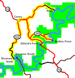 - Buffalo Point and Beyond, Approximately 38 miles, some gravel roads, Route: Caney (10 miles south of Yellville) to Maumee, to Rush, to Buffalo Point, and to Dillard's Ferry. From Caney to Maumee, many open pastures can be seen. The North Arkansas Mining Company developed the area known as Maumee in the late 1890s for the purpose of mining zinc ore. The company’s land surveyor named the area for the Maumee River in Ohio near which he was raised. The peak mining activity was during World War I. Now this area is a popular put-in point for canoeists. The crushing mill foundations and the entrance to the Maumee Mine can be seen along the road to the canoe launch, just outside of the park boundary. When zinc ore was discovered on Rush Creek in the 1880s, a community developed to support the influx of workers. By the 1890s, the mining boom was well established and miners and investors arrived from all over the country. It was written that so many people came that local farmers could not keep the town supplied in fresh meat and eggs. Some fifteen mines operated in the Rush District. The most famous mine at Rush was the Morning Star Mine. A quarter mile trail loops through the remains of the Morning Star area. Structures along the loop include the smelter, blacksmith shop, mill and other foundations. A longer trail (approximately 3 miles one way) rises above the valley floor crossing steep, rocky terrain and past mine ruins. Mines are very unstable and entry is prohibited. Trail guides are available at the Buffalo Point Ranger Station. The area known as Buffalo Point was developed through cooperation among the National Park Service, the Civilian Conservation Corps and the Arkansas State Parks Commission, and was established as Buffalo River State Park in 1938. All of the Civilian Conservation Corps structures are listed on the National Register of Historic Places. Several hiking trails ranging in length from a quarter mile to three and a half miles lead hikers to a scenic vista, caves, a waterfall, and other interesting features. Interpretive programs are given regularly in the summer. Schedules and trail guides are available at the Ranger Station. Doc Dillard built the original ferry (named Dillard’s Ferry) with his sons Ira and Pate and W. Davenport in the early 1900s. The old ferry crossing is just a few meters downstream from the present bridge and was in operation until the bridge was completed in 1959. In December 1982 a flood covered the bridge. The river was about 65 feet (19.8 meters) above normal water level, making this the biggest flood in the river’s recorded history.