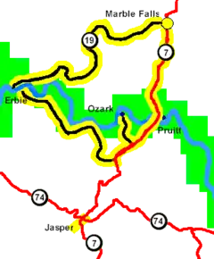 - Erbie Loop, Approximately 24 miles, mostly gravel roads, Route: Marble Falls (13 miles south of Harrison; may still be called Dogpatch on older maps) to Erbie to Highway 7 and return to Marble Falls. County Road map highly recommended. Marble Falls was once the home of Dogpatch USA, a theme park that centered around Al Capp's "L’il Abner" cartoon series. The park is no longer operational. The waterfall for which the town is named is located on property that was once part of the park, with a deserted train bridge high over the water. The Marble Falls Post Office is located on what was once the park's parking lot. The road from Marble Falls to the river winds through scenic forest and pastoral lands. About a half mile before the Buffalo River, Cecil Cove Loop Trail allows hikers to follow a nearly seven-mile trail that follows Cecil Creek and loops past an old homestead site and cemetery. After the left turn at the intersection of the Cecil Cove Trailhead, the Erbie Church and then the Rulus Jones Homestead will be visible on the right. The church, along with the nearby school, post office and store formed the center of the Erbie community. The former residents say the church was built in 1896. The church has continued to be available for services to the present time. The homestead, built by Rulus in 1922, shows the evolution from log homes to frame houses. This frame house replaced a log cabin that dated to the late 1830s. After the river crossing, the Parker-Hickman home is one of the oldest structures standing in the Buffalo National River. In the late 1830s, Alvin Parker and his brother Greenberry arrived from Tennessee and built a home here using the nearby red cedar trees. Joining the hand-hewed logs with half dovetail notches, the Parkers crafted one of the finest log houses in the Buffalo River valley. The Cedar Glade Picnic Area is located near the Henry R. Koen Experimental Forest. This picnic area overlooks the river and has an accessible trail leading to South Pond and a fishing dock across the road. A non-handicapped accessible hiking trail leads to North Pond and a 0.4-mile trail connects the ponds. The Koen Interpretive Trail (accessible) leads through the Henry R. Koen Experimental Forest, which was established in 1950. Over 34 species of trees and plants have been designated along its loop. Trail guides are available at the Pruitt Ranger Station and the Forest Service Office in Jasper. Ozark Campground was once owned by the Shaddox family who planted the fertile valley with peas and corn. Today, it is a popular spot for camping, swimming, and canoe access.
