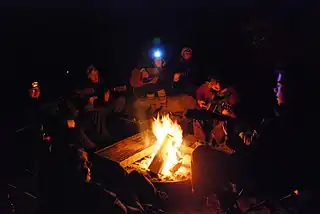 A campfire is a controlled outdoor fire, lit to provide lighting, warmth, deterrent of pests and aggressive animals, opportunities for outdoor cooking, and a priceless sense of community during camping.