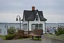 Riparian shuffleboard and Baie de Chambly seen from rue Martel, in Chambly, with Mont Saint-Hilaire in the background