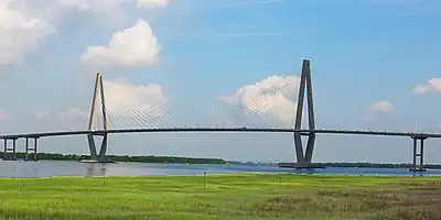 Charleston is the largest and oldest city in the state of South Carolina in the United States of America. Its historic downtown is on a peninsula formed by two rivers, the Ashley and the Cooper, flowing into the Atlantic, and protected from the open ocean by surrounding islands. Charleston was captured in the American Civil War without much property damage, so the historic part of town has buildings that are hundreds of years old. The current downtown skyline, with practically no tall buildings due to the city's height restriction ordinance, is dominated by church steeples and the stunning Arthur Ravenel cable-stay bridge over the Cooper River. The city is a major port on the eastern seaboard of the U.S. and a popular destination for domestic and international tourists.