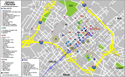 Uptown is laid out in a grid, with numbered streets running east-west with few exceptions. Streets running north-south have proper names. From any direction, it is fairly easy to know where you are relative to the central intersection of Trade & Tryon St. If you are using a paper map, you might note that the street grid is aligned at a 45-degree angle relative to the compass; "North" streets actually go northeast.