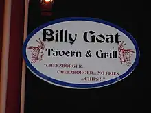 - π The Billy Goat, 430 N Michigan Ave, Lower Level (Grand Red Line), β +1-312-222-1525. M-F 6AM-2AM, Sa 10AM-2AM, Su 11AM-2AM. The original location of the famous cheezborger joint. Due to its location under the Tribune Tower, this one has been a haunt for Chicago newspapermen for decades. The burgers are dry and little more than patty and cheese, but delicious nonetheless. $4-7.