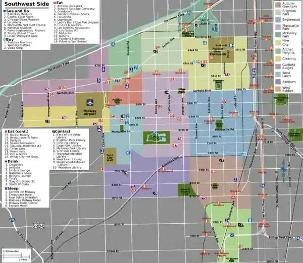 Englewood also deserves a mention, but mostly as a warning — it is a large, impoverished, and relatively violent neighborhood with just about nothing to offer a traveler. It is generally best to just roll through on one of the main roads (e.g., 55th St) or to avoid the area altogether.