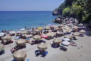 - π Agii Saranta Beach (from Chorefto, follow the beach road south, around the camping and up the steep incline, a signed road 250 m after the road levels leads to Agii Saranta; from Makryrrachi, between a church and small supermarket, take the signed road from the main road; this road is rough in part, but you will find the road leading down to Agii Saranta in 2.6 km). One of the most beautiful beaches in Pilio. Clear waters and fine sand surrounded by a lush forest that forms a gorgeous amphitheater. There are some pleasant tavernas and bars, serviced umbrellas and even some rooms to let. On weekends in the summer, crowds from Volos ensure parking near the beach is full (often before noon); consequently, access can be problematic, as for a portion of the descent only one car can progress in either direction around a blind hairpin turn. This will often lead to a queue of cars needing to reverse up or down a steep incline. Best solution is to park at some of the wider lay-bys on the descent and walk down.