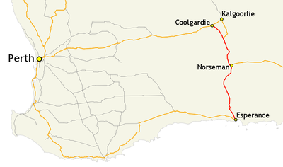 Coolgardie–Esperance Highway is located in the Goldfields–Esperance region of Western Australia. It links the goldfields towns of Kalgoorlie and Coolgardie with the coastal town and port of Esperance.