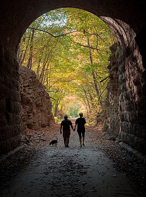 - Great Allegheny Passage — By combining the GAP and the C&O Canal towpath, cyclists can enjoy a car-free ride from Pittsburgh all the way into Washington, D.C. This 333 mi (536 km) route is mostly flat and you'll find hundreds of options for eating, drinking, and sleeping scattered across its length. Along the way you'll cross the Eastern Continental Divide and the Mason–Dixon line. You'll also pass by Harpers Ferry, Fallingwater, and a variety of steam-age bridges and tunnels. Due to its robust transit connections and amenities, this is probably the easiest way to get started with distance routes in the USA.