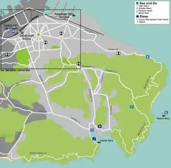 - 🌍 Tiger Beach Ocean Park (老虎滩海洋公园; Lǎohǔtān Hǎiyáng Gōngyuán), 9 Binhai Middle Road (滨海中路9号) (south of the city centre; take bus routes 2, 4, 47, 403 or 404 and get off at the Jiefang Road bus stop), ☏ +86 411 82689356. 08:00-17:00. This tourist area is somewhat misnamed, as there really is not a beach to speak of. There are a number of tourist attractions, the most prominent of which is the Polar Aquarium. Other attractions include the Sea Creature Aquarium, the Coral Aquarium, the Bird Forest and the Happy Theatre. Though popular with tourists, the area, though pretty, is unlikely to hold the attention of more jaded overseas tourists for long and is perhaps best seen as a starting point for journeys along Binhai Road. Apr 10-Oct 31: ¥198, Nov 1-Apr 9: ¥180 (includes all major attractions but does not include transport within the park); tour boats are ¥100-120, express boats are ¥120, the cable car is ¥60 one-way or ¥80 two-ways, and the sightseeing car is ¥15.