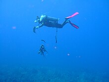 Submarine coral islands occur intermittently between the inner and outer reefs.- Abram on the submarine island at 38 m. He continued and crossed to the Fathom. The photographer went left and finished on the Inner Reef, which can just be discerned in the left background.