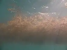 Booms have been proposed to control the deposition of weed on beaches. But how thick is the layer and hence the required depth of such a boom?. The first picture was taken quite close up on a calm day in November 2014 off Crane Beach. The Weed appears coherent, organised and fairly compact. But there is no scale.