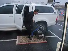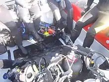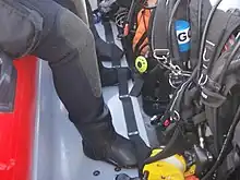 Occasionally there may be a seat across the stern in front of the motors. This will be the most comfortable place on the boat but may catch more spray in your face. The boat will bounce up and down as it hits waves. Bigger boats less so than small ones, and the part that bounces the least is the stern, so the most comfortable seating is as far back as you can get. This puts you close to the motors, and if they are two-stroke, closest to the exhaust smoke when the boat is not moving. You may not have much choice where you get to sit, but if you have a bad back or other disability which makes a rough ride a problem, mention this to your dive-master or the skipper as soon as possible. You will not be popular if the boat has to stop to re-arrange passengers. With practice it is possible to sit with one foot in a foot-strap (preferably the foot nearer the bow (pointy end)) and ride the bumps with very little effort. It is much like riding a horse, don’t fight the motion, absorb the bumps by relaxing a bit, and you will bounce less. A death-grip on the hand ropes will be exhausting if the ride is long.