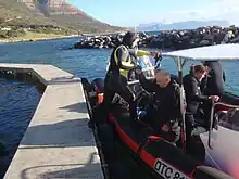 Rule 1: Do not take off your fins in the water unless there is a ladder. You need them to boost you up. Most rubber ducks do not provide a boarding ladder. This is even more important if you are boarding on the upwind side of the boat, as the boat will almost always drift downwind faster than a diver. Approach the boat and get a grip on the outer hand-rope. Try to retain a grip on the boat at all times, and let go only for as long as absolutely necessary to remove kit, as the boat may drift away while you are not holding on.
