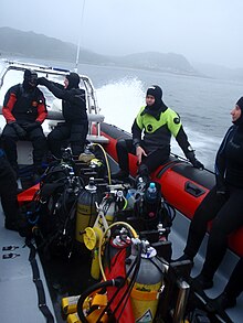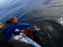 Getting into the water is usually done by a synchronised backward roll – falling into the water alongside your neighbour, neither on top nor underneath. Generally all the divers or a nominated group will roll off together, on a countdown from the skipper or divemaster. It is important to all roll together, as if you do not, the later divers may fall on top of the earlier ones, possibly casing injury or equipment damage. If you are not ready, or are not happy with this procedure, wait until the others are in and the boat is clear of them. The skipper will then let you roll in clear of the others, but you may have to fin a bit to get to them. This can be a problem if diving in a current. Some divers may not wish to backward roll with a large camera setup. They can ask the skipper to pass the camera to them when in the water. In this case they should stay close to the boat and preferably hold onto it until their camera is passed down.