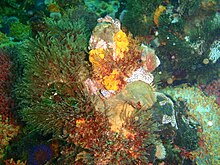Benthic invertebrates provide most of the bright colours on the reefs of this region, and the distribution of species is as characteristic of the different sub-regions as the depth and water temperature. The diversity is large, and there is a big variation in the predominant reef cover with both depth and geographical location. The characteristic reef life varies considerably between the east and west sides of the Cape Peninsula, and this is recognised as the border between the South Western Cape and Agulhas Inshore Bioregions. The vertical zonation is also characteristic of the different bioregions, so there can be very noticeable differences in what can be seen at the various sites.