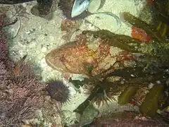 False Bay is one of the most reliable places to view Great White sharks, although rarely as a diver, and several other shark species are also frequently seen. The Sevengill or Cowshark can often be seen at a few sites, while Gully sharks and catsharks are more widespread. There are four common catshark species locally, from the colourful puffadder shyshark to the much larger pyjama shark. Other pelagic sharks are usually only seen on offshore "blue-water" dives off the south peninsula, and several large pelagic fish species can be seen on similar trips.