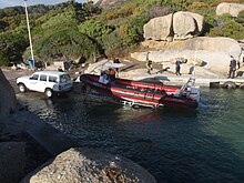 Getting out onto a beach is unusual in Cape Town, but relatively straightforward. It is usually safer and more convenient to get off on the low side if the boat tilts when running up the beach. If you are on the high side, wait until there is space and move to the low side, or in some cases the high side will become the low side as the boat flops back as the load is removed. Don’t try to unload kit over the high side, in case you are in the wrong place and the boat rolls down on top of you. This is particularly likely if the boat is not fully clear of the waves.